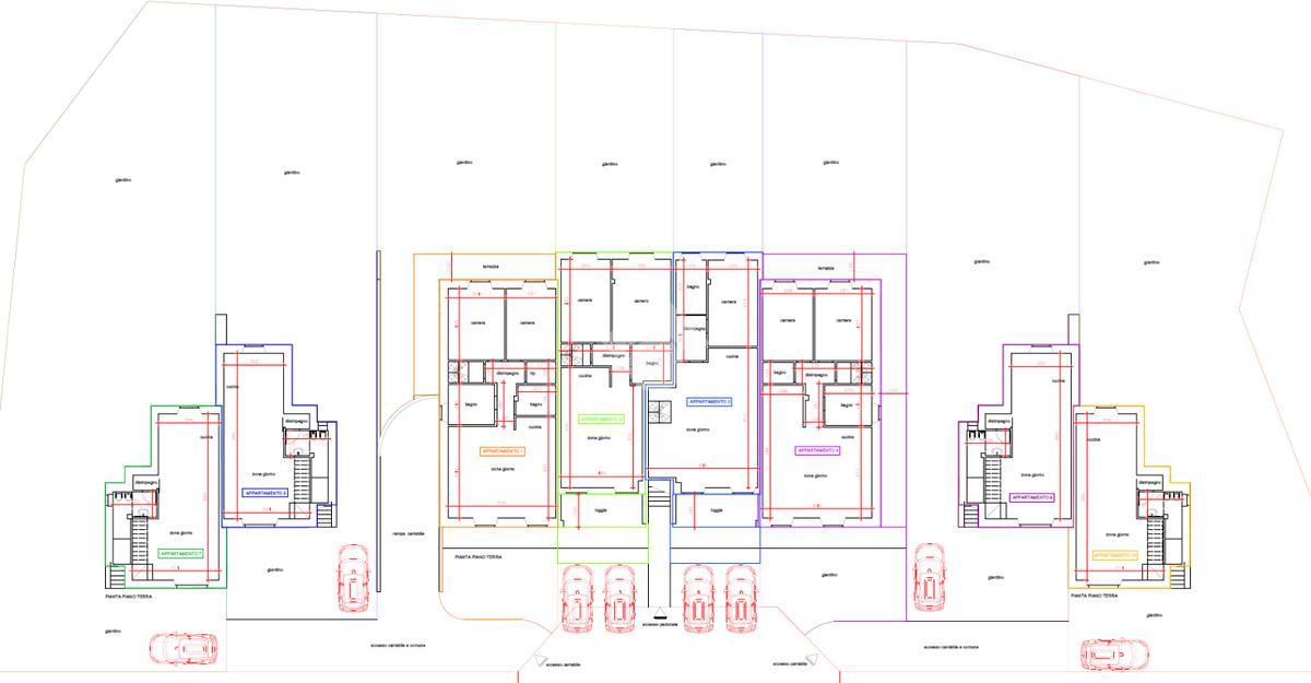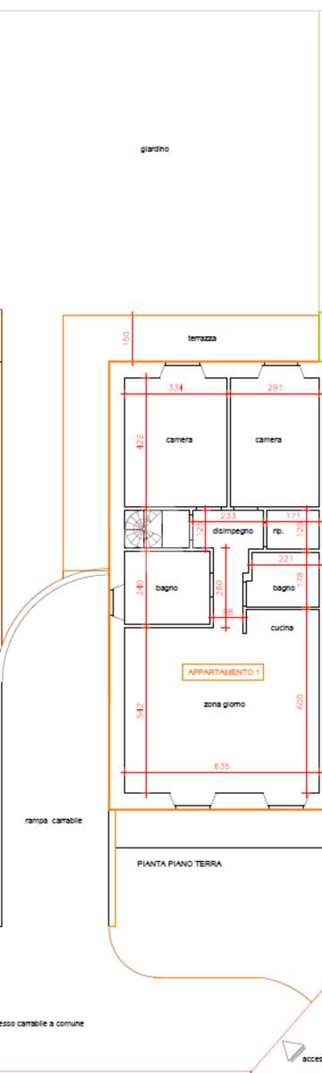 Entrando troviamo subito l'ampia zona giorno open-space, proseguendo zona notte con due camere con terrazzo e accesso al giardino tergale, doppi servizi e ripostiglio con scala che collega internamente l'appartamento al piano seminterrato.