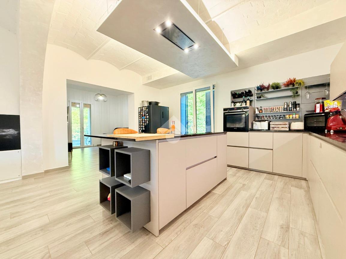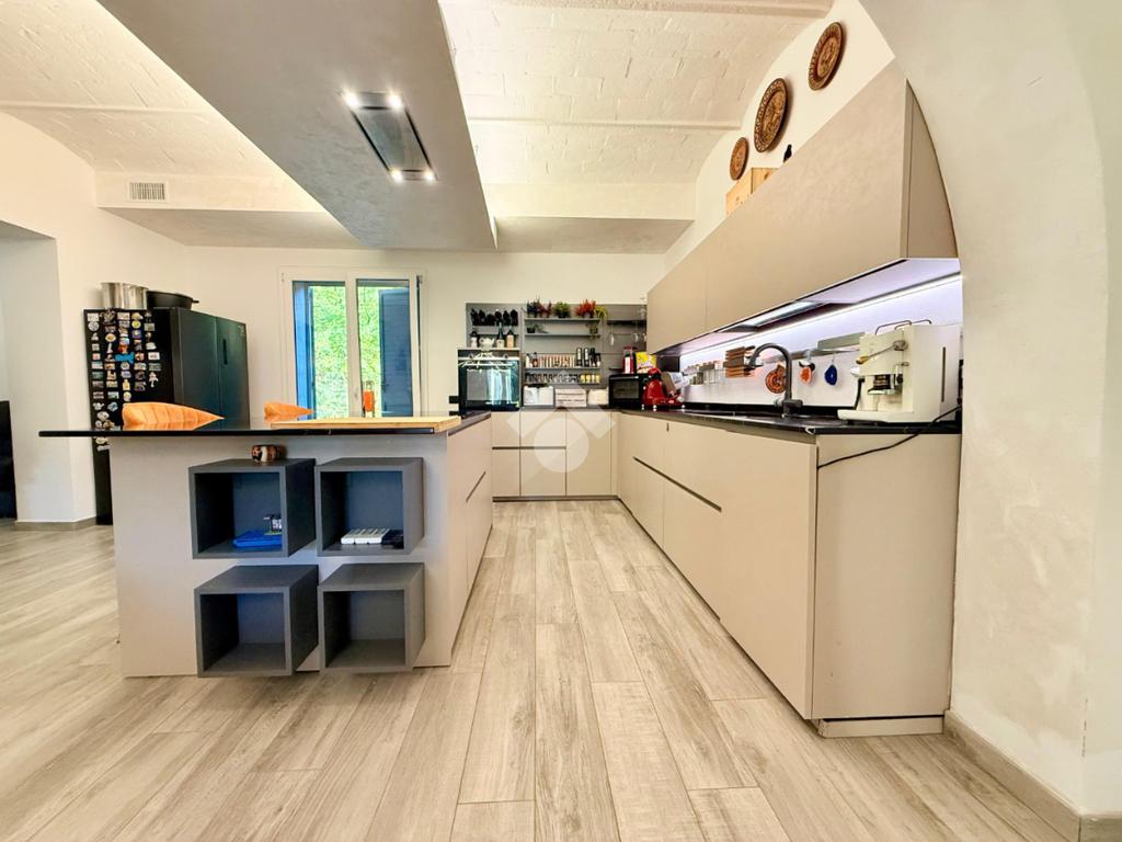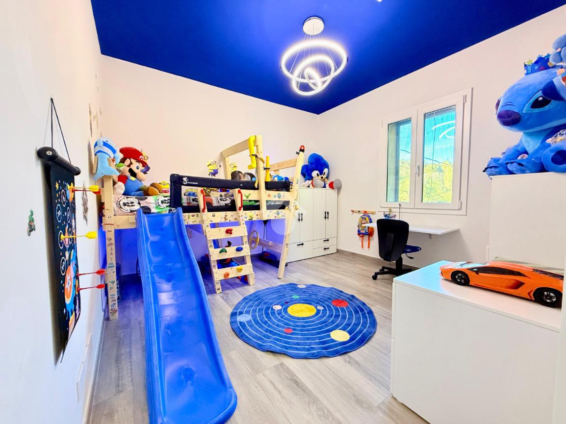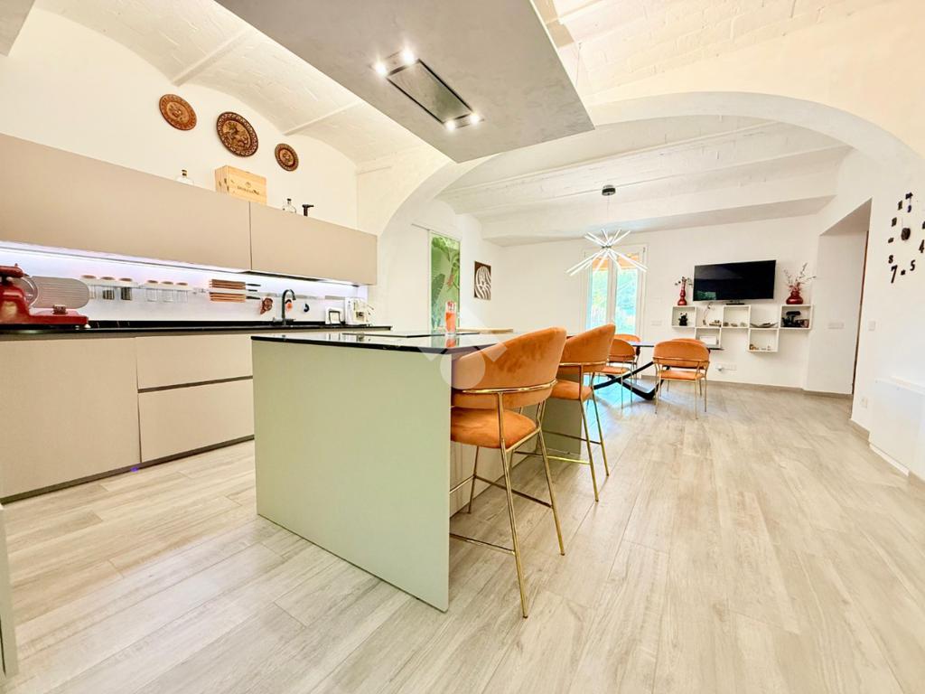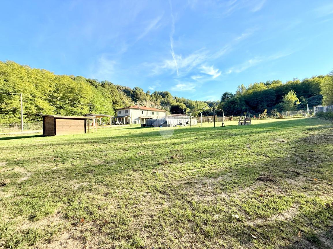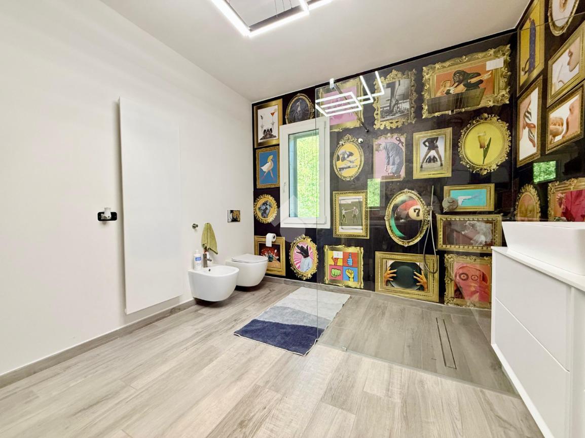 Completano giardino esclusivo e terreno di circa 3.000 metri quadri che circondano l'immobile e due autorimesse.